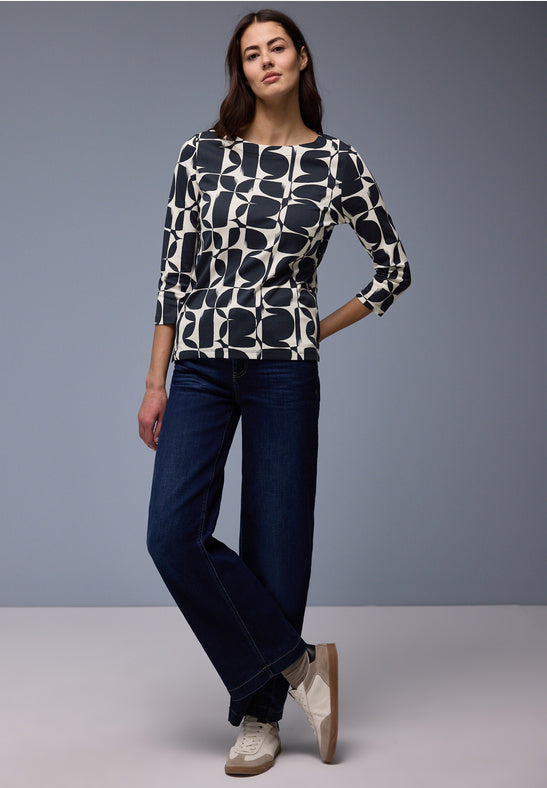Elevate your everyday wardrobe with this versatile Basic Interlock Top in Shadowed Navy. Featuring a classic round neck and comfortable 3/4 length sleeves, it's the perfect layering piece for any season. The eye-catching all-over geometric print adds visual interest and modern style to your casual looks. Crafted from quality interlock fabric, this top delivers both comfort and durability for everyday wear you'll reach for again and again.