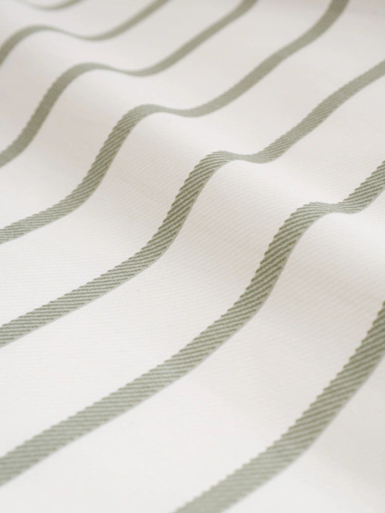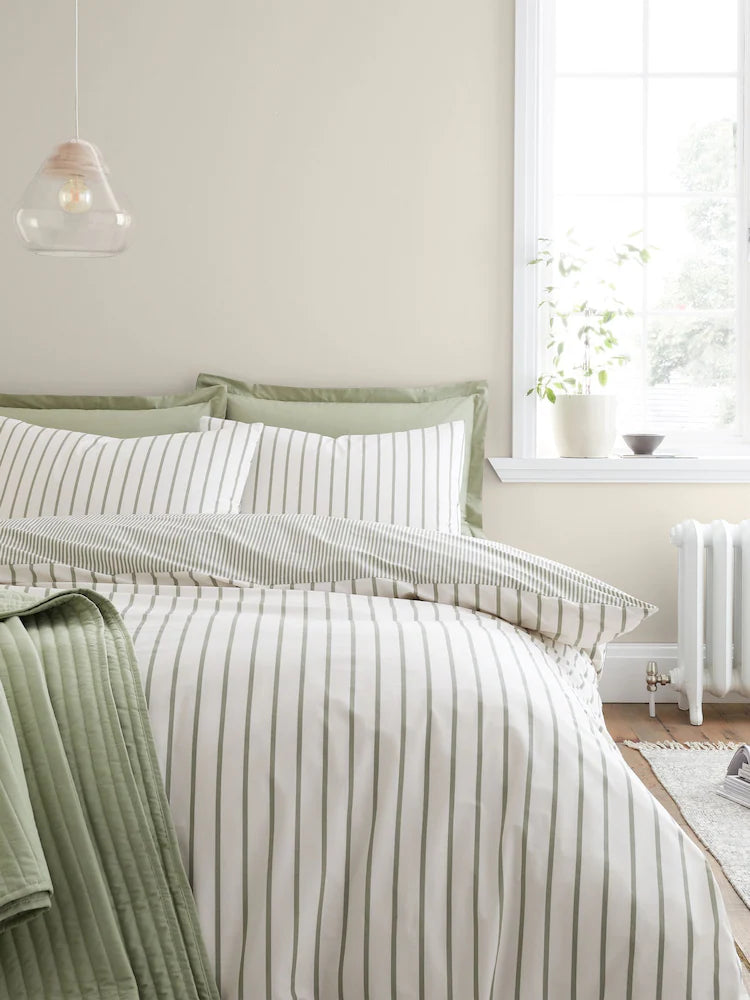 Bianca evokes a sense of well-being and relaxation, perfect for creating a calming retreat with timeless styling for the modern home. Elevate your sleep sanctuary with our timeless classic stripe bedding, designed for effortless luxury. Featuring a soothing green and cream palette, its subtle elegance brings a sense of calm to any space. Fully reversible, the refined design transitions seamlessly with a smaller, delicate stripe on the reverse. Dream in blissful comfort under wonderfully soft 200 thread count percale cotton, a beautiful naturally breathable fibre that encourages a better night’s sleep. Pure cotton means the natural fibres create a fabric that is soft and breathable. The 200 thread count percale weave creates a smooth, soft hand feel. Fully reversible for two stylish looks in one. Button fastening keeps your duvet securely in place. Envelope closure provides a secure and snug fit for your pillow. Wash before use. Machine wash at 40 degrees. Tumble dry safe.