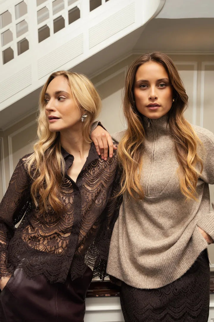 The Caty Blouse in Chocolate Torte is your go-to piece for making an unforgettable impression. Crafted from delicate sheer lace, this sophisticated blouse offers an alluring, elegant silhouette perfect for nights out and special occasions. The luxurious fabric drapes beautifully against your skin, creating a captivating look that commands attention. Whether you're heading to a party or a night on the town, this versatile blouse pairs effortlessly with your favorite pieces to create a show-stopping ensemble. Embrace your confidence and let this stunning lace creation be the star of your wardrobe.