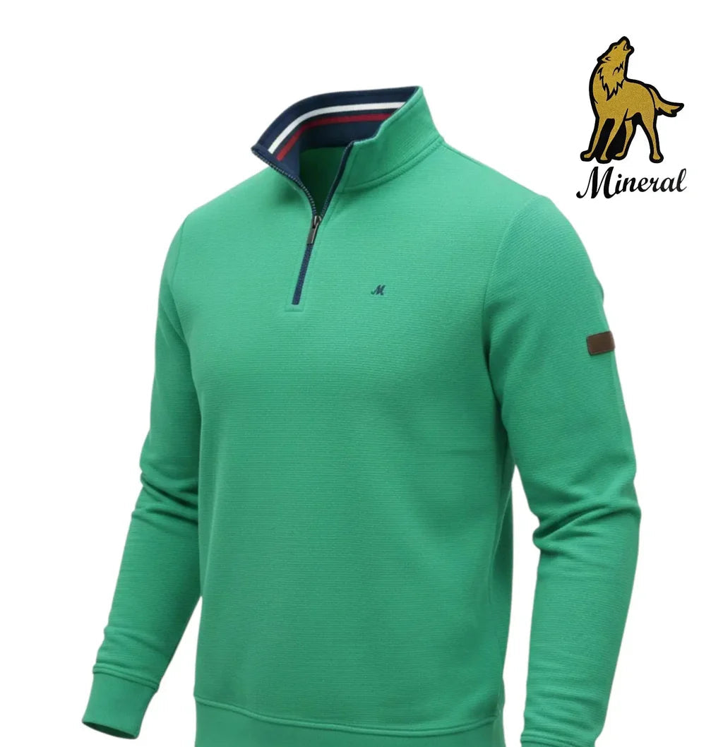 Refresh your seasonal wardrobe with the Mineral Brendan quarter zip sweatshirt in a striking green hue. This premium piece offers a perfect blend of athletic inspiration and refined casual style for the modern gentleman.