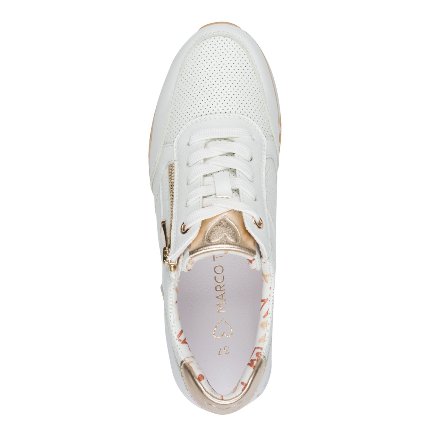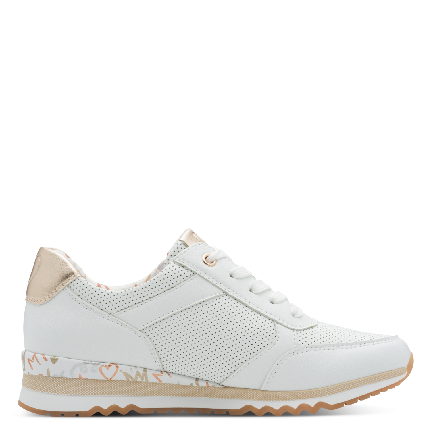 Step into sunshine with the by Marco Tozzi ladies trainer, flaunting a synthetic leather upper adorned with intricate perforated panels and shimmering gold details that add a luxe touch. The padded ankle collar and signature FEEL ME soft footbeds cradle your feet in cloud-like comfort, while the side zip closure and lace-up fastening ensure a snug, secure fit. The 40mm three-tone wedge sole, featuring a chic marble effect panel, brings irresistible summer vibes and stylish flair to every stride.