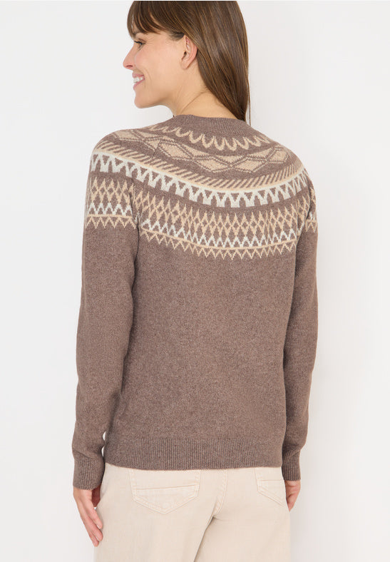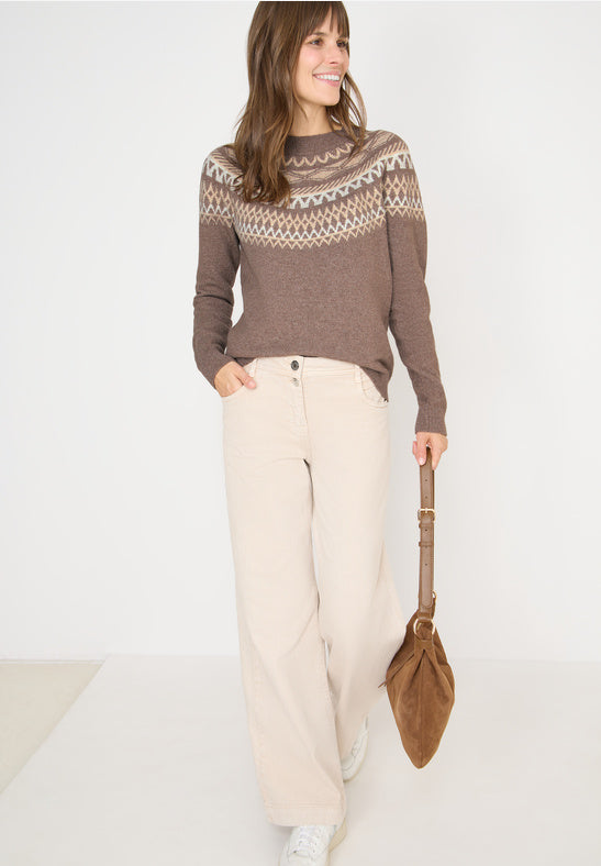 This Fairisle jumper features a classic round neck and long sleeves, crafted in neutral tones that add a subtle warmth to your wardrobe. The intricate Fairisle pattern blends traditional style with contemporary wearability, making it a versatile piece for layering or standalone comfort in cooler weather. The eggshell melange base enhances its timeless appeal with a refined, expert finish.