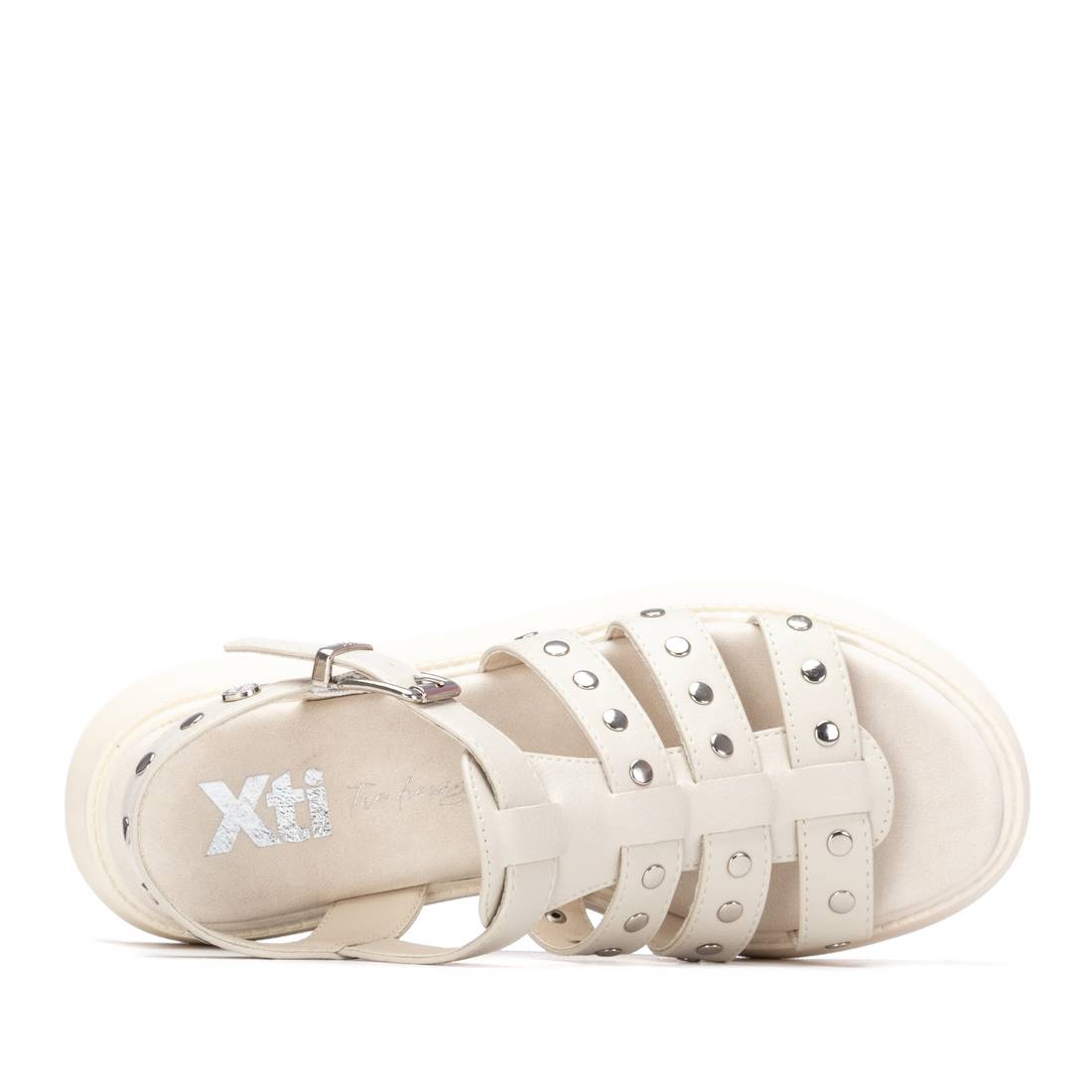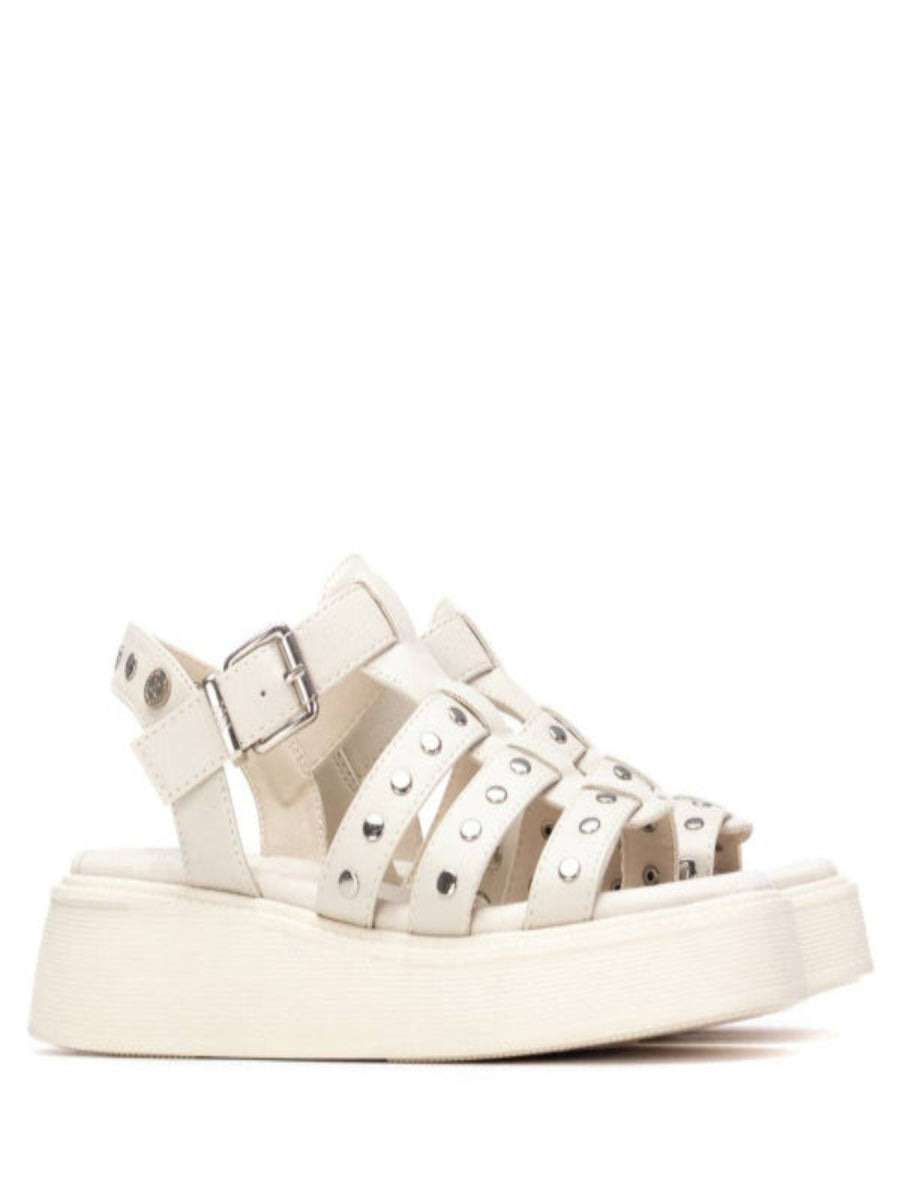 Embrace effortless style with this flat gladiator sandal in crisp ice tones. Featuring bold rivet detailing along the straps, it delivers an edgy yet wearable aesthetic perfect for warm-weather dressing. The flat sole ensures all-day comfort, while the gladiator silhouette adds contemporary flair to casual outfits and weekend adventures.