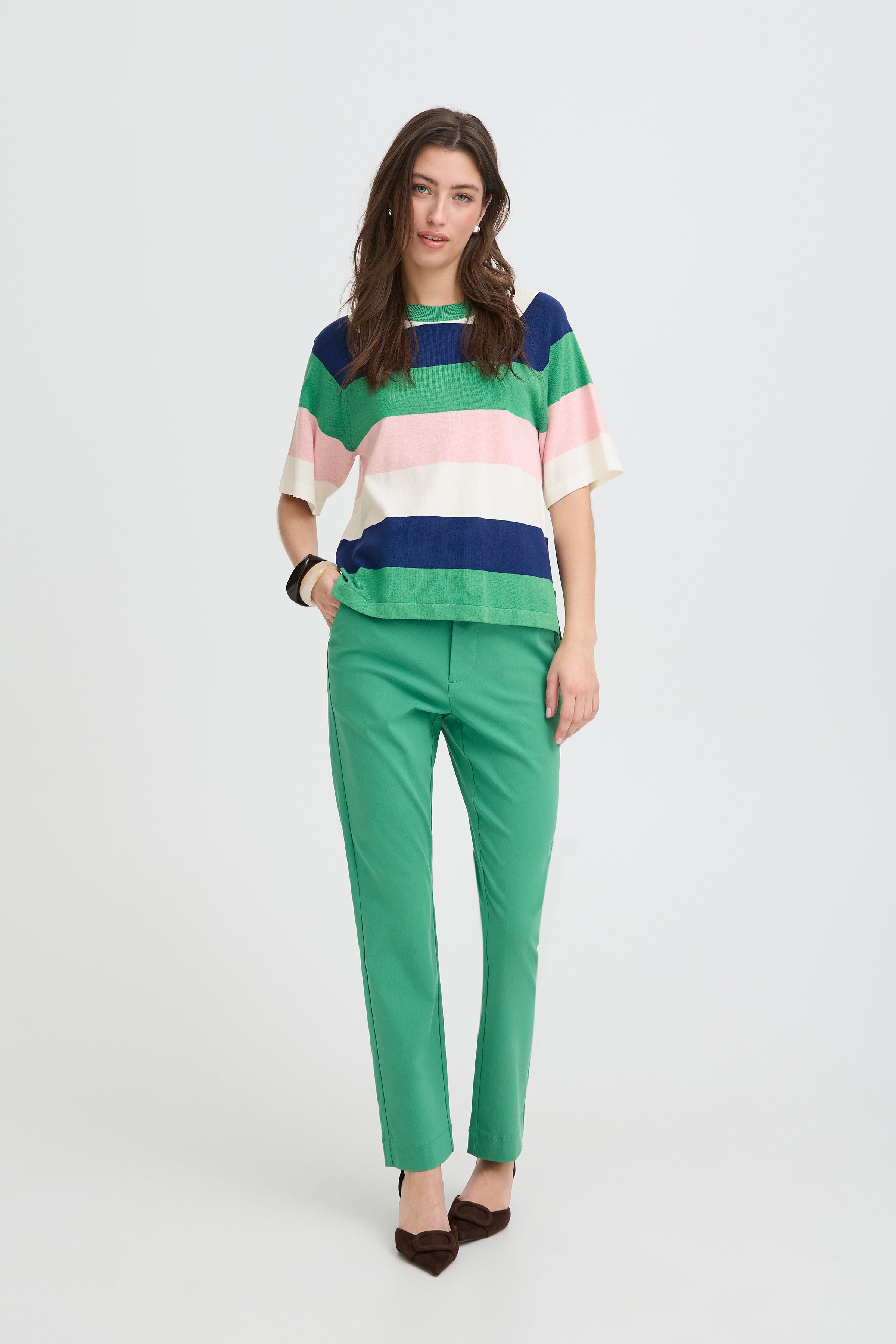 Elevate your everyday wardrobe with this striking short-sleeve jumper, featuring bold horizontal stripes in vibrant hues that instantly brighten any outfit. The classic round neckline and relaxed fit make it effortlessly versatile—perfect for layering or wearing solo. Whether you're heading to the office or out for casual weekend plans, this eye-catching knit delivers style and comfort in equal measure. A timeless piece that transforms your look with minimal effort.