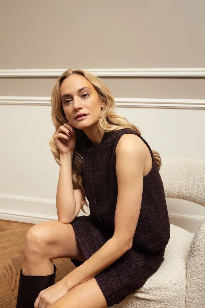 Elevate your wardrobe with the Odette Waistcoat in Fudge, inspired by classic Chanel styling. This plaid waistcoat delivers timeless sophistication through its structured silhouette and refined pattern, perfect for layering with tailored pieces or adding a polished touch to a casual outfit. The rich, earthy tones and impeccable cut ensure you project effortless elegance, making it a versatile staple for the modern sartorialist.