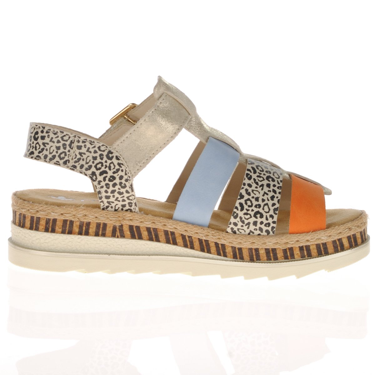 Gorgeous gladiator style sandals on a comfortable platform with animal print, orange, blue and metallic uppers from Rieker.