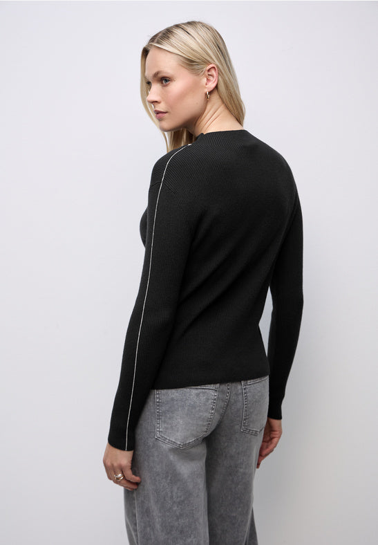 This black ribbed knitted turtle neck jumper combines classic design with subtle detailing for a refined look. Crafted for comfort and warmth, it features a delicate contrasting white stripe on the sleeve that adds a distinctive touch without overwhelming the minimalist aesthetic. Ideal for layering or wearing alone, this jumper offers versatility and timeless style.